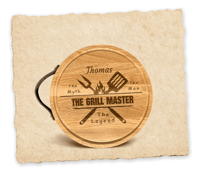 Rundes Schneidebrett aus Eichenholz mit Ledergriff 30 cm Durchmesser (Preis inkl. Gravur)