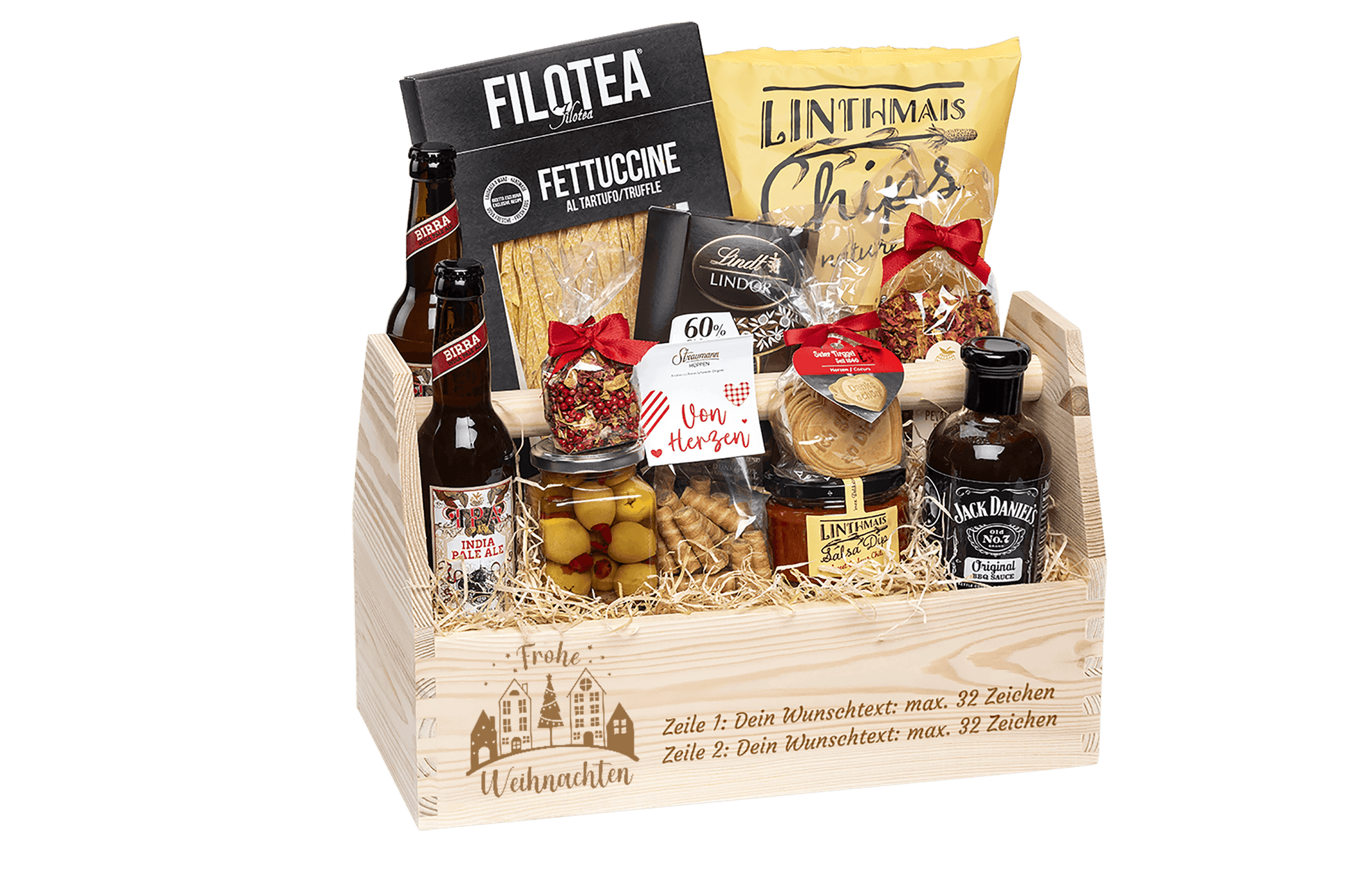 Diese stilvoll gravierte Geschenkbox bringt kulinarische Highlights und festliche Genussmomente direkt unter den Weihnachtsbaum. Von edler Trüffelpasta bis zu süssen Verführungen: Die Feinschmecker Genusskiste vereint sorgfältig ausgewählte Spezialitäten zu einem Geschenk, das Herzen höherschlagen lässt.